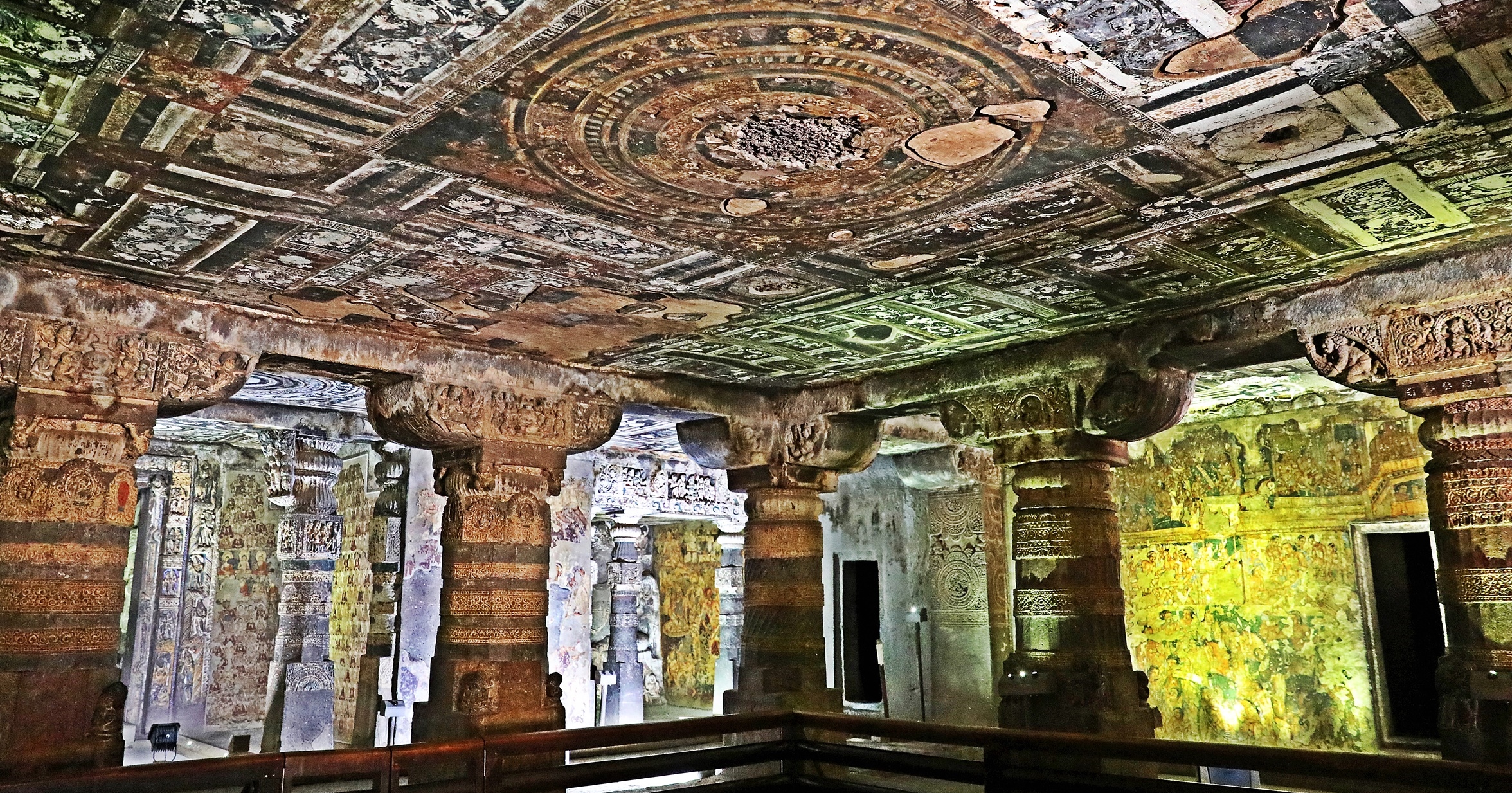 In addition to the incredible sculptures, the highlight of the Ajanta caves are the magnificent frescoes on the walls, columns and ceilings. Many of the details in these colourful paintings can still be seen. The frescoes include depictions of Buddha’s life, rebirth and his teachings. Others are of his consorts and Bodhisattvas.